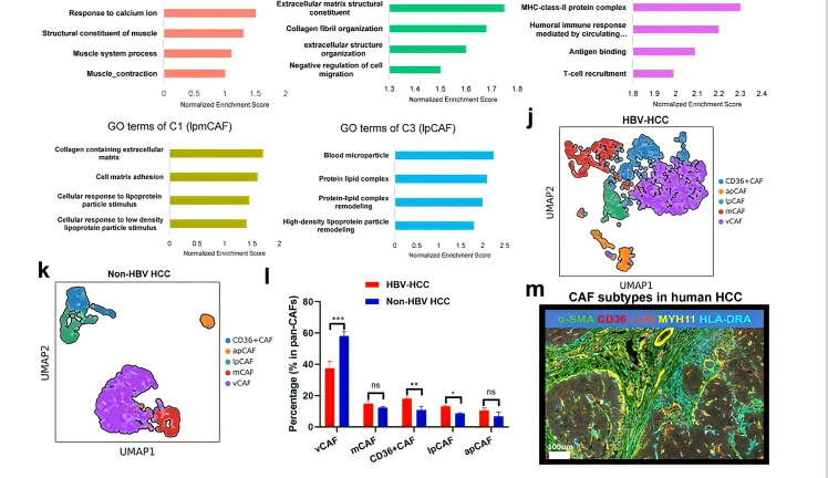 Subcluster 0 CAFs accounted for the majority of the CAF populations (40%) and were characterized by signature microvasculature genes, such as MYH11, MUSTN1, and MCAM (Fig. 1f, g and Supplementary Fig. S1g). Thus, we designated them vascular CAFs (vCAFs, vCAFs-c0-MYH11). Gene ontology (GO) and KEGG analyses of vCAFs indicated significant enrichment in vascular smooth muscle contraction and response to calcium ions, consistent with their microvascular signatures (Fig. 1h, i). Subcluster 2 CAFs expressed low levels of α-SMA and high levels of extracellular matrix (ECM) signatures, including collagen molecules (COL5A1 and COL6A3), periostin (POSTN), LUM, DCN and FAP (Fig. 1f, g and Supplementary Fig. S1h). Interestingly, the GO terms enriched in this subtype were associated with ECM and collagen fibril organization. Hence, we accordingly designated them as matrix CAFs (mCAFs, mCAFs-c2-LUM, Fig. 1h, i). KEGG analysis showed that the epithelial to mesenchymal transition (EMT) pathway was highlighted in mCAFs (Supplementary Fig. S1i). Similar to mCAFs-c2-LUM, subcluster 1 CAFs also expressed high levels of COL6A3 and COL1A1 as well as high levels of lipid metabolism-related genes (CD36 and STEAP4, Fig. 1f, g and Supplementary Fig. S1h). Additionally, the GO and KEGG terms enriched for this subcluster were related to ECM, cholesterol metabolism, hallmarks of fatty acid metabolism and reactive oxygen species (ROS) pathways (Fig. 1h, i and Supplementary Fig. S1j, k), indicating that this subcluster may engage in both ECM and cholesterol metabolism. Accordingly, CAFs in this subcluster were named lipid processing (lp)-mCAFs (lpmCAFs, lpmCAFs-c1-CD36; Fig. 1f, g). Subcluster 3 CAFs expressed high levels of lipid processing markers, including APOA1 and APOC1 (Fig. 1g and Supplementary Fig. S1g). Interestingly, GO and KEGG analyses of these CAFs indicated significant enrichment in protein-lipid complex remodeling and hallmark of fatty acid metabolism; therefore, we termed them lipid-processing CAFs (lpCAFs, lpCAFs-c3-APOA1; Fig. 1h, i). Consistent with a previous report concerning human PDAC5 and ICC tumors12, we found that subcluster 4 CAFs expressed major histocompatibility complex II (MHCII) genes, such as CD74 and HLA-DRA, as well as chemokine-related genes, such as CCL5 (Fig. 1f, g and Supplementary Fig. S1h). Moreover, the GO terms and KEGG pathways enriched in this subcluster were related to the MHC-class-II protein complex and antigen processing and presentation (Fig. 1h, i and Supplementary Fig. S1l); therefore, we termed them antigen-presenting CAFs (apCAFs, apCAFs-c4-HLA-DRA). Finally, to explore the heterogeneity of CAF subtypes caused by different etiologies, we performed scRNA-seq of 7 non-HBV-related HCC tumors and found that the proportions of CD36 CAFs and lpCAFs were significantly decreased in non-HBV HCC (including alcohol-, fatty liver- or drug-induced HCC) compared with HBV-HCC (Fig. 1j–l and Supplementary Fig. S1m, n), which may be caused by HBV protein-induced lipid metabolism and oxidative stress in HBV-related HCC+13. Finally, we confirmed the presence of the main CAF subsets in human HCC samples using multiplex immunofluorescence (mIF) staining (Fig. 1m).