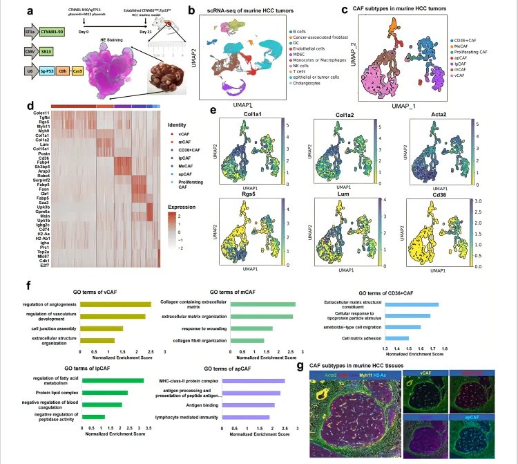 a Schematic diagram of established HCC murine model by HDTVi. b UMAP plots showing different cell types from scRNA-seq data in murine HCC tissues. c UMAP plots showing CAF subtypes in murine HCC tissues. d Heatmap showing the top DEGs (Wilcoxon test) in each cell types in murine HCC tumors. e UMAP plots for each marker genes in murine CAF subtypes. f GO analysis in different murine CAF subtypes. g Multiplex immunofluorescence staining showed major CAF clusters existed in murine HCC tissues.