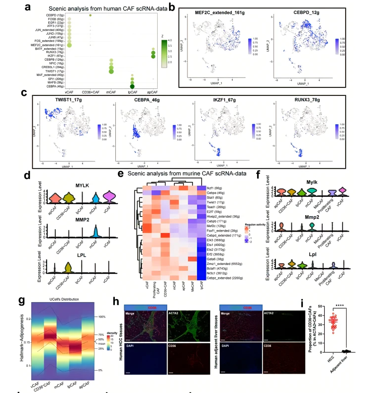 To detect master regulators that are active in these murine CAF subpopulations, SCENIC analysis was conducted and showed that Mef2c and Foxf1 were active TF genes in murine vCAFs, similar to human vCAFs (Fig. 3e, f). Similarly, Twist1, Cebpd, Cebpa and Ikzf1 were also active TFs in murine mCAFs, CD36 CAFs, lpCAFs and apCAFs, respectively (Fig. 3e). Immunostaining assays further showed co-staining of these highly expressed TFs in different CAF subtypes in both human and murine HCC tumors (Supplementary Fig. S7a). Collectively, these results identify key TFs driving or maintaining the gene expression programs in identified CAF subtypes, providing further insights into the gene regulatory networks underlying CAF heterogeneity in HCC tumors.+