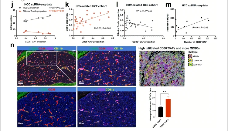CD36 CAFs are positively correlated with MDSCs and are in close proximity to MDSCs in HCC tumors+