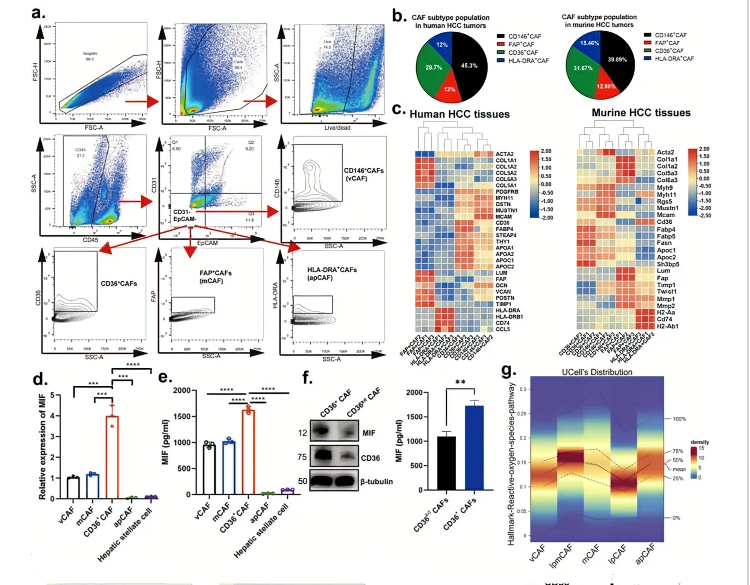 Following the identification of CAF subtypes in human or murine HCC tumors, we next explored the specific crosstalk mechanisms between CAFs and other cells in the TME. Notably, among all known ligand-receptor pairs, the MIF signaling pathway is dominated by MIF ligand and its CD74/CXCR4 receptor. Interestingly, lpmCAFs and lpCAFs, which commonly and highly expressed CD36 (Fig. 1g), were the most prominent sources of MIF ligands acting on MDSCs (Supplementary Fig. S6g). Further IHC experiments showed that CD36 expression was mainly located in HCC stromal regions (Supplementary Fig. S7b). We therefore identified CD36 in these two subclusters, lpmCAFs (c1-mCAF-CD36) and lpCAFs, using specific surface markers and found that they were both enriched in adipogenesis pathways (Fig. 3g) and accounted for ~35% of the CAF population in HCC, indicating their crucial role in HCC progression. Further mIF experiments showed that CD36 CAFs infiltrated specifically in tumor tissues compared with adjacent liver tissues in both murine and human tissues (Fig. 3h, i and Supplementary Fig. S7c, d). Survival analysis showed that a high number of CD36 CAFs indicates poor prognosis in HCC patients (Supplementary Fig. S7e).++