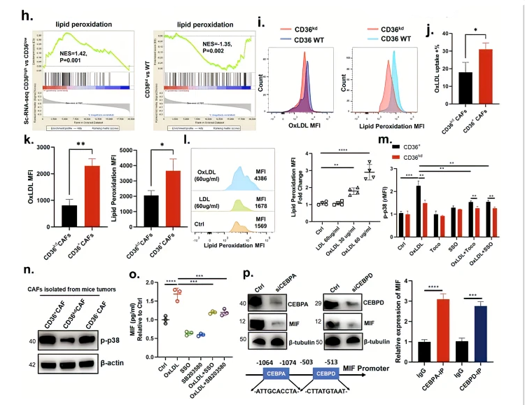 From our SCENIC analysis, we found that CEBP family (CEBPA and CEBPD) TFs, reported to be crucial for lipid metabolism, were enriched specifically in CD36 CAFs (including lpmCAFs and lpCAFs). Previous studies have identified p38MAPK as a key regulator of CEBPA and CEBPD activation+25,36. Therefore, we first examined whether MIF secretion is dependent on p38-induced CEBPA and CEBPD activation in CD36 CAFs. When CEBPA and CEBPD were silenced separately, we observed that MIF was significantly decreased in CD36 CAFs treated with OxLDL (Fig. 4p). Then, we performed bioinformatics analysis to identify the potential binding sites of CEBPA or CEBPD in the MIF promoter (Fig. 4p). Next, Chromatin Immunoprecipitation (ChIP) assays were conducted and revealed that both CEBPA and CEBPD could directly bind to the MIF promoter (Fig. 4p). Collectively, these results demonstrate that CD36 mediates OxLDL uptake to promote MIF expression via the lipid peroxidation/p38/CEBP axis.++