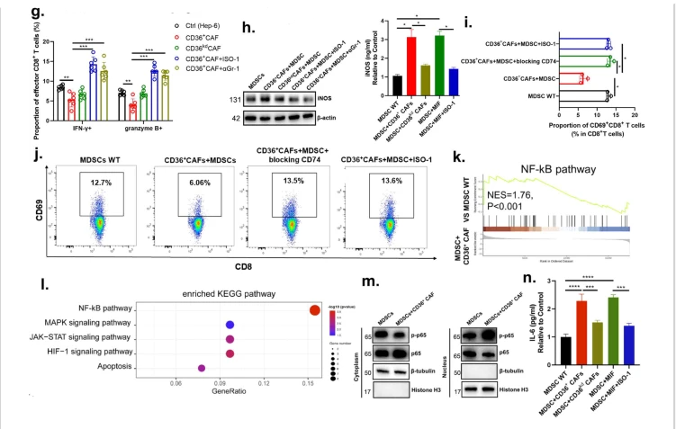 Finally, to explore the molecular mechanisms by which CD36 CAF-derived MIF affect MDSCs, we conducted RNA-seq and compared the MDSC-MIF and MDSC groups. The results showed that the nuclear factor kappa B (NF-κB) signaling pathway, which was ranked as the top pathway and has been reported to regulate cytokine secretion in MDSCs, was activated in MDSCs pretreated with CD36 CAF-derived MIF (Fig. 5k, l). To investigate the downstream signals underlying the mechanical stimuli leading to CD36 CAF-associated MDSC expansion, we first examined the phosphorylation of NF-κB protein p65 in MDSCs induced by CD36 CAFs and in those from the peripheral blood of HCC patients. We found that the phosphorylation of p65 was increased in MDSCs induced by CD36 CAFs (Fig. 5m). p65 activation has been reported to significantly induce iNOS and IL-6 secretion+++++44,45. ELISA results showed that iNOS and IL-6 secretion was significantly upregulated in MDSCs induced by CD36 CAFs or MIF compared with controls (Fig. 5n).+