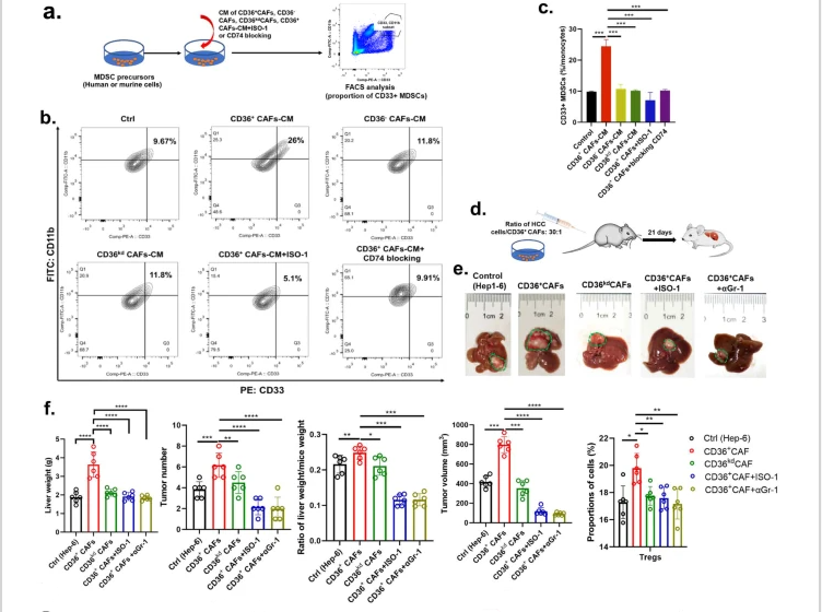 CD36 CAFs or CD36+kd CAFs (5 × 105 cells/well at 12-well plate), CD33 MDSCs (2 × 10+5 cells/well at 48-well plate) and HCC cells (5 × 105/well at 12-well plate) were cultured in serum-free DMEM-F12 or RPMI-1640 with 1% FBS for 24 h. To obtain CM of CAFs-educated CD33 MDSCs, CM from CAF were used to culture blood CD33 MDSCs for 6 h followed by culturing with fresh serum-free medium for another 24 h. All CM were filtered and used for further study. Blood CD33 MDSCs were stimulated with MIF (20 ng/mL, #HY-P7387, MedChemExpress), CM from tumor cells, CD36 CAFs or CD36++++kd CAFs (the ratio of volume: 1:1) without or with neutralizing ISO-1 (10 nM, #HY-P7387, MedChemExpress) and/or Stattic (100 nM, HY-13818, MedChemExpress) for 24 h, respectively.