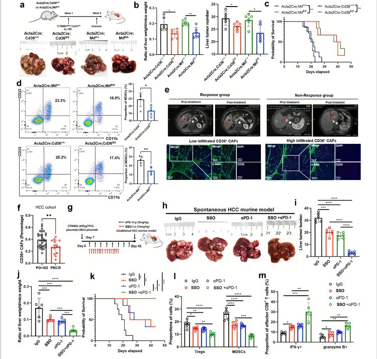 According to the above findings, CD36 CAF-derived MIF promoted immunosuppressive MDSC accumulation and accelerated HCC progression. To further investigate whether CD36 and MIF CAFs play a role in HCC initiation, we established Cd36 (Acta2+++Cre;Cd36fl/fl) and MIF (Acta2Cre;Miffl/fl) conditional knockout 6-week-old mice to determine that HCC tumor burden and the proportion of MDSCs were significantly reduced when Cd36 or MIF was knockout in vivo (Fig. 6a–d), which indicated CD36 CAFs were involved in HCC initiation. Monocytic MDSCs have been reported to be immunosuppressive and correlated with poor response to immunotherapy in cancer+46. Additionally, the cancer stemness induced by MDSCs has been found to promote immunotherapy resistance in multiple cancer types37,38. Therefore, therapeutically targeting or reducing MDSCs combined with immune checkpoint blockade agents could enhance T-cell immunotherapy and achieve optimal antitumor efficacy. To this end, we also hypothesized that the population of CD36 CAFs was associated with the efficacy of immunotherapy in HCC patients.+