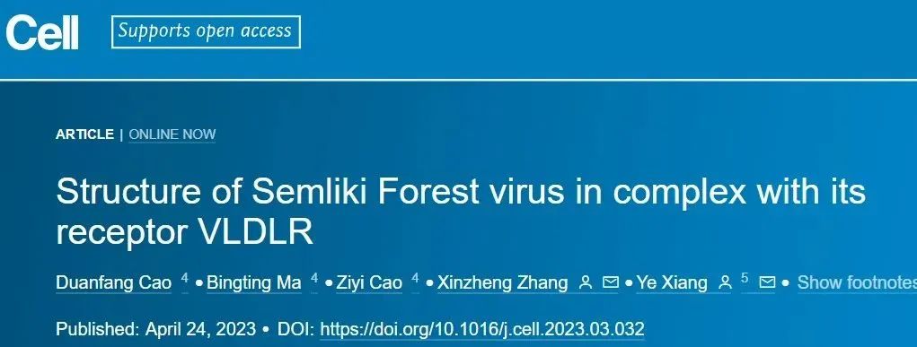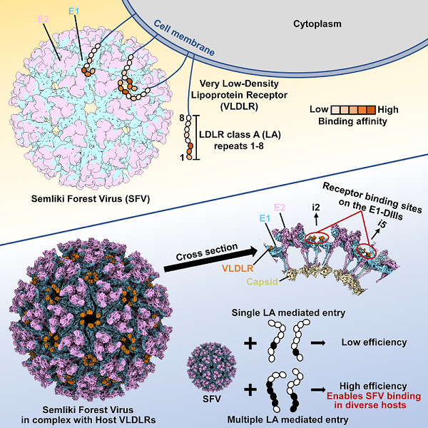 2021年的一篇研究报道表明,载脂蛋白受体VLDLR(very-low-density lipoprotein receptor)是包括塞姆利基森林病毒(Semliki Forest Virus, SFV)在内的多种甲病毒感染蚊虫、鼠、马、人等多个物种的通用受体。不过,病毒与这类受体的结合模式及其介导的跨物种传播机制尚不清楚。近日,《细胞》(Cell)杂志在线发表了中国科学院生物物理研究所章新政课题组和清华大学医学院向烨课题组合作完成的研究论文,该工作解析了SFV与人源受体VLDLR复合物的高分辨率冷冻电镜结构,鉴定了一种甲病毒全新的受体结合位点,揭示了受体VLDLR的多个相似串联结构域通过协同作用与SFV特异性结合的新型机制。该研究首次阐释了通用受体分子介导病毒实现跨物种传播的分子机制,为抗病毒药物设计及新型疫苗开发提供了新靶点。