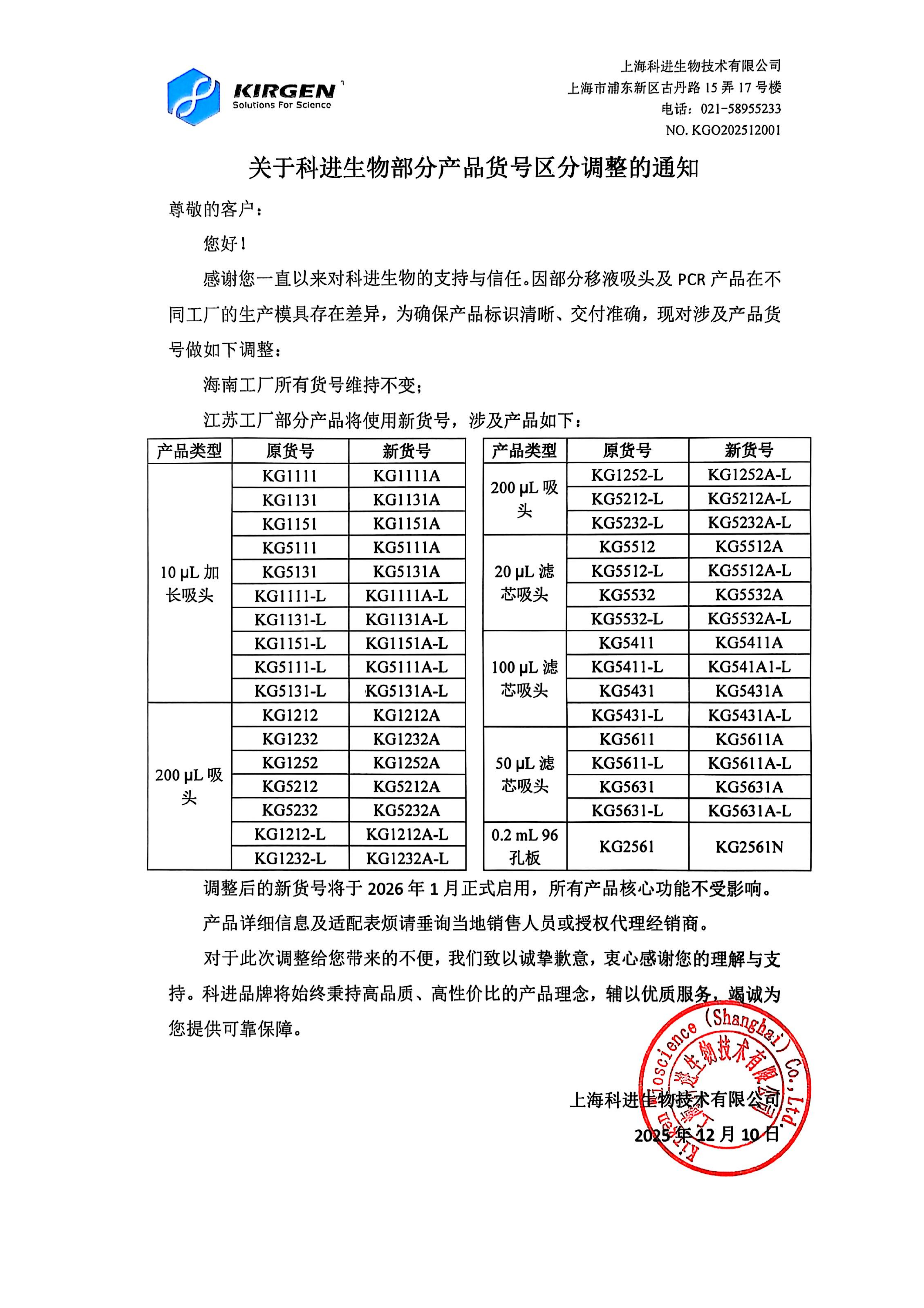 关于科进生物部分产品货号区分调整的通知 NO.KGO202512001
