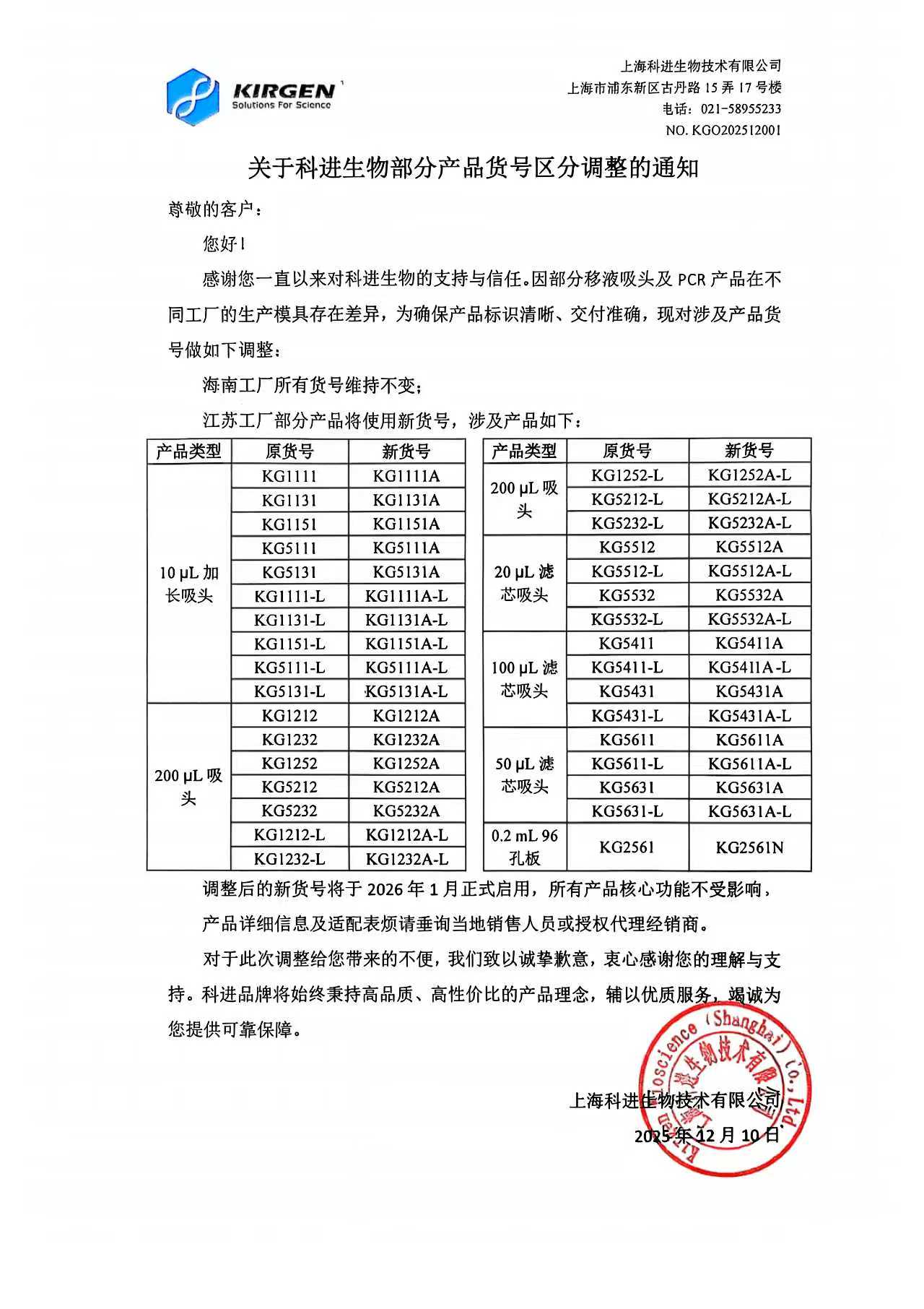 关于科进生物部分产品货号区分调整的通知 KGO202512001