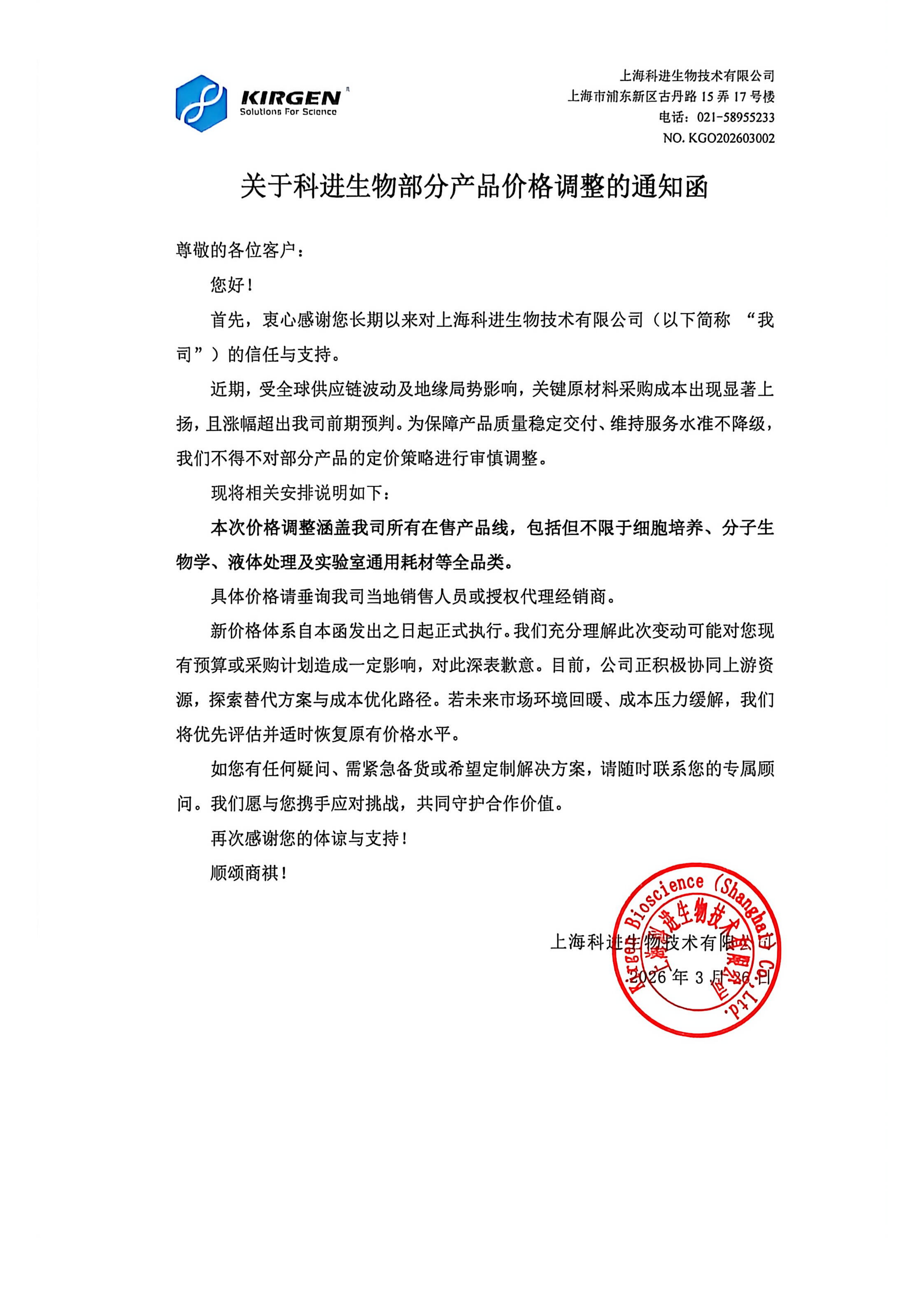关于科进生物部分产品价格调整的通知函 NO. KGO202603002